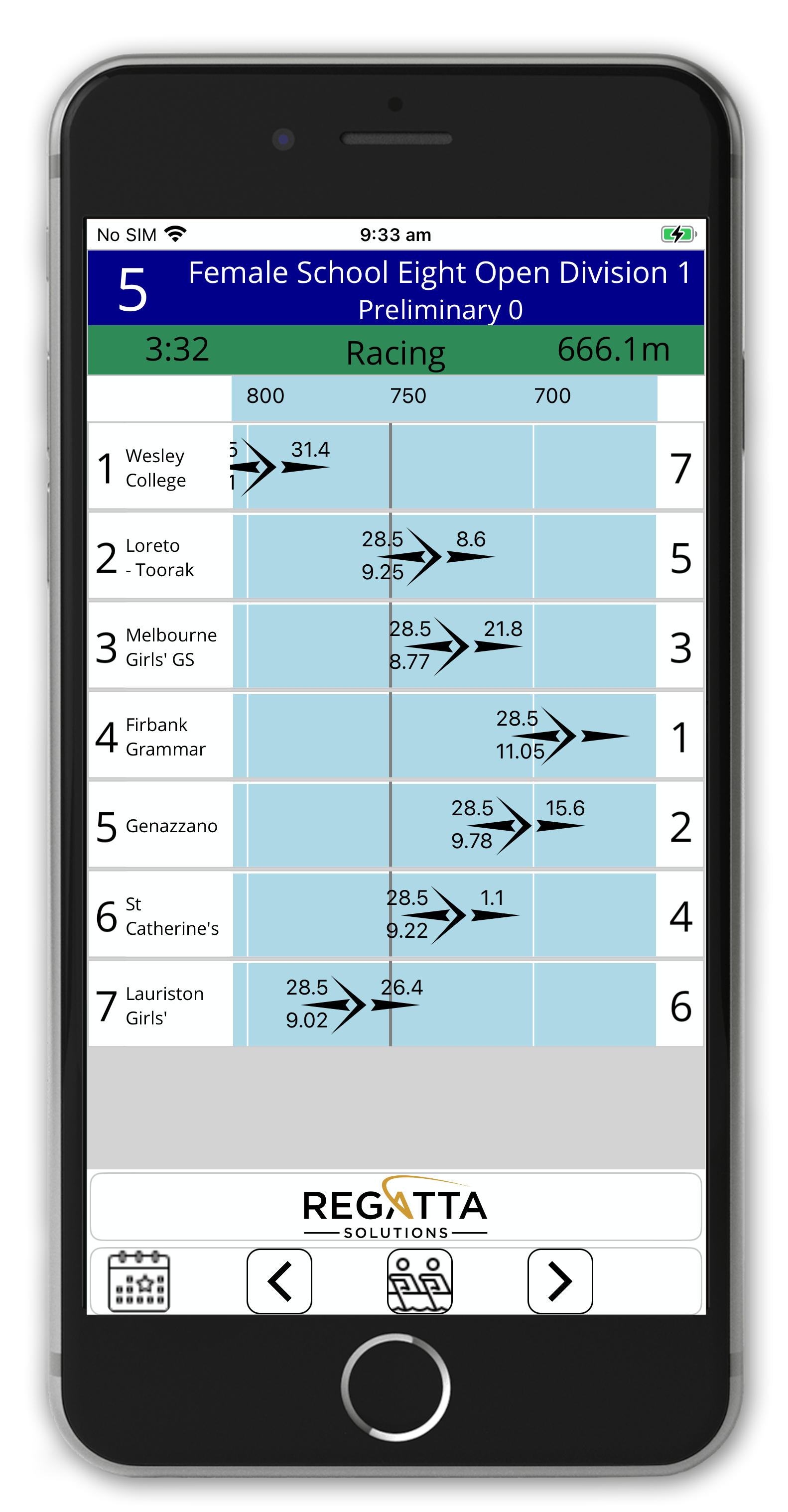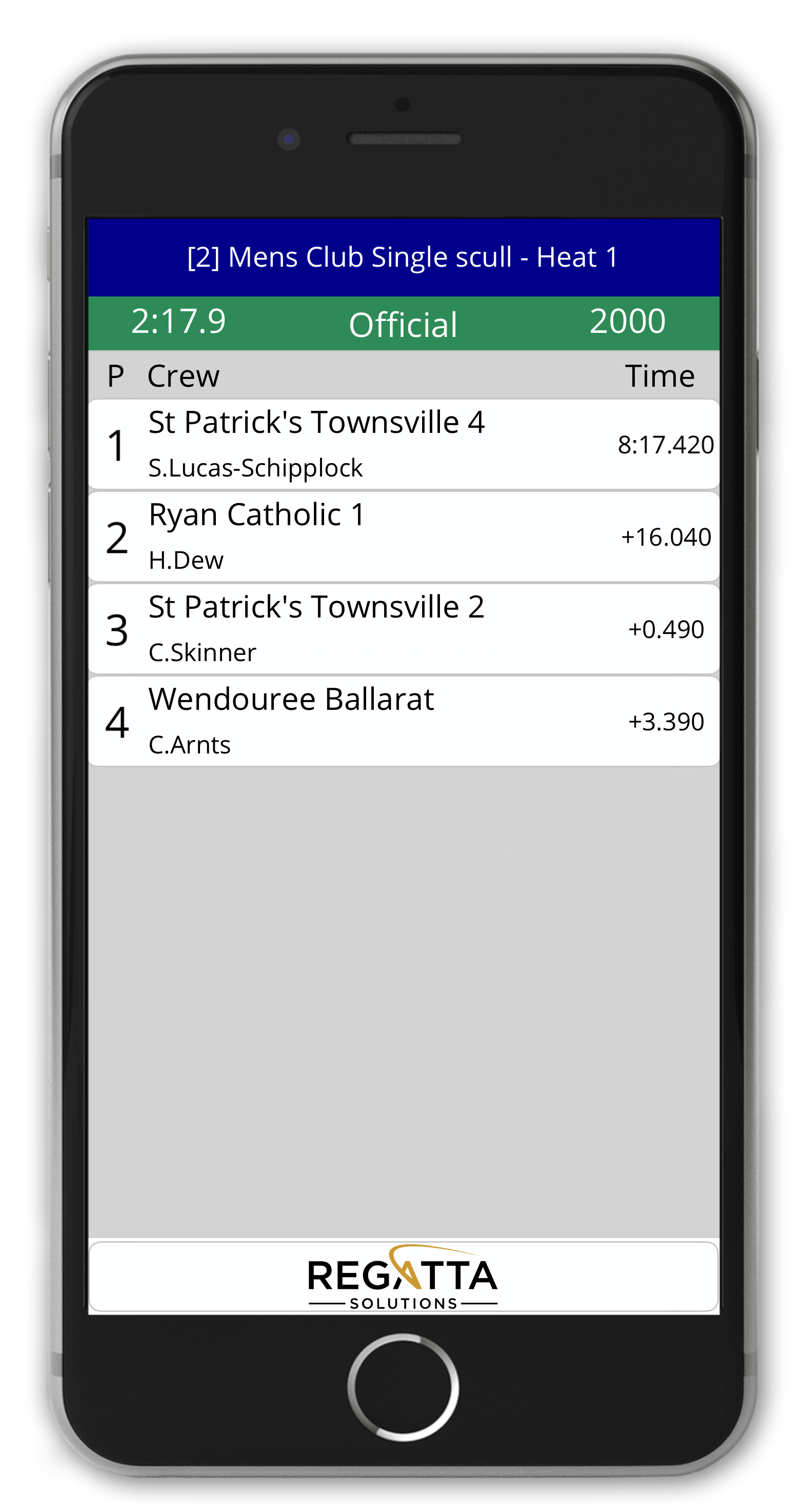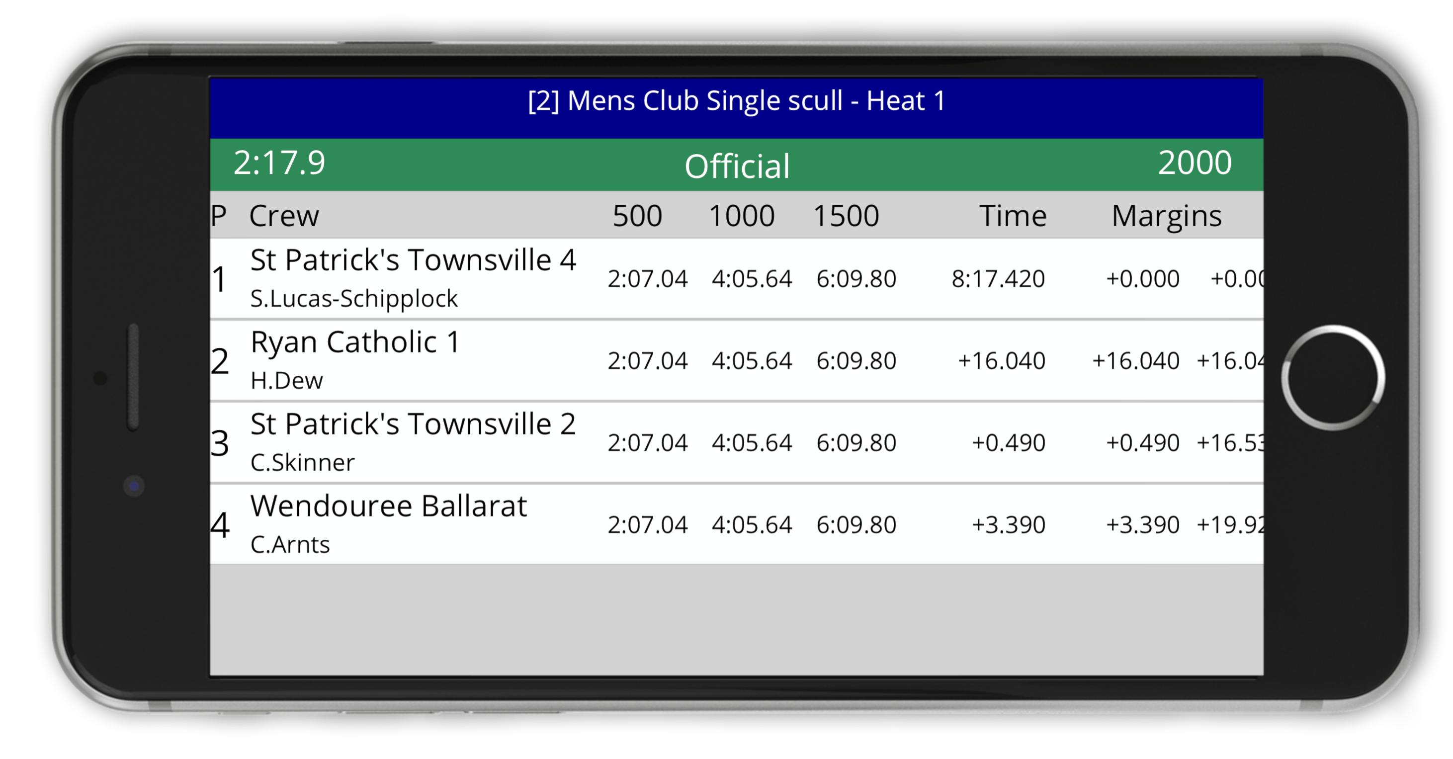 Results ViewThe Regatta Solution Spectator app provides fast access to both preliminary results and when published the official results. Turning the phone into ‘Landscape’ mode we provide a full breakdown of split times and margins. If two crews are less that 2 meters apart the app will show the result as too close to call and you will need to wait for the official results to be published. For subscribers the preliminary results are available as soon as a crew crosses the finish line. For non subscribers the results are available 60 seconds after the last crew crosses the line. |